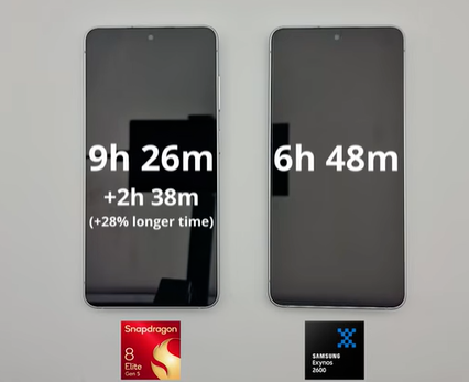 三星S26系列使用了差异化芯片策略,根据测试数据显示,骁龙版的续航表现明显胜过猎户座版本,续航时长的差距高达39%。